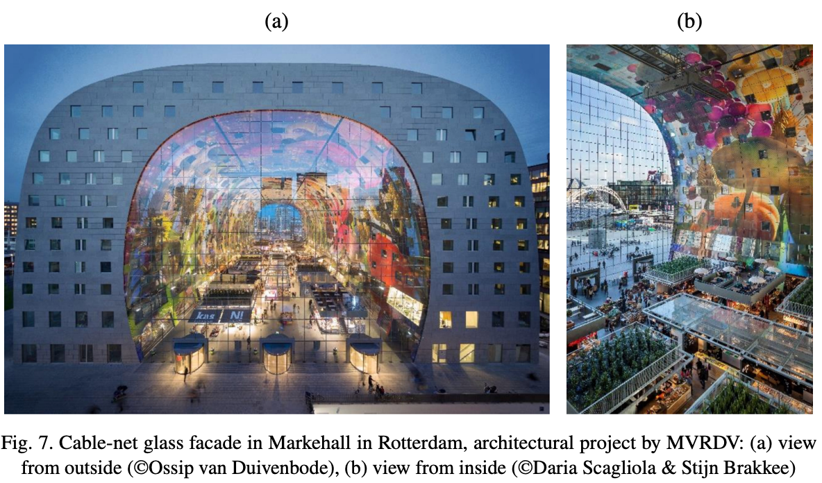Perhaps the most iconic example is the Markthalin Rotterdam (MVRDV, 2014), where 35×42 m façades are suspended using an orthogonal cable-net system.